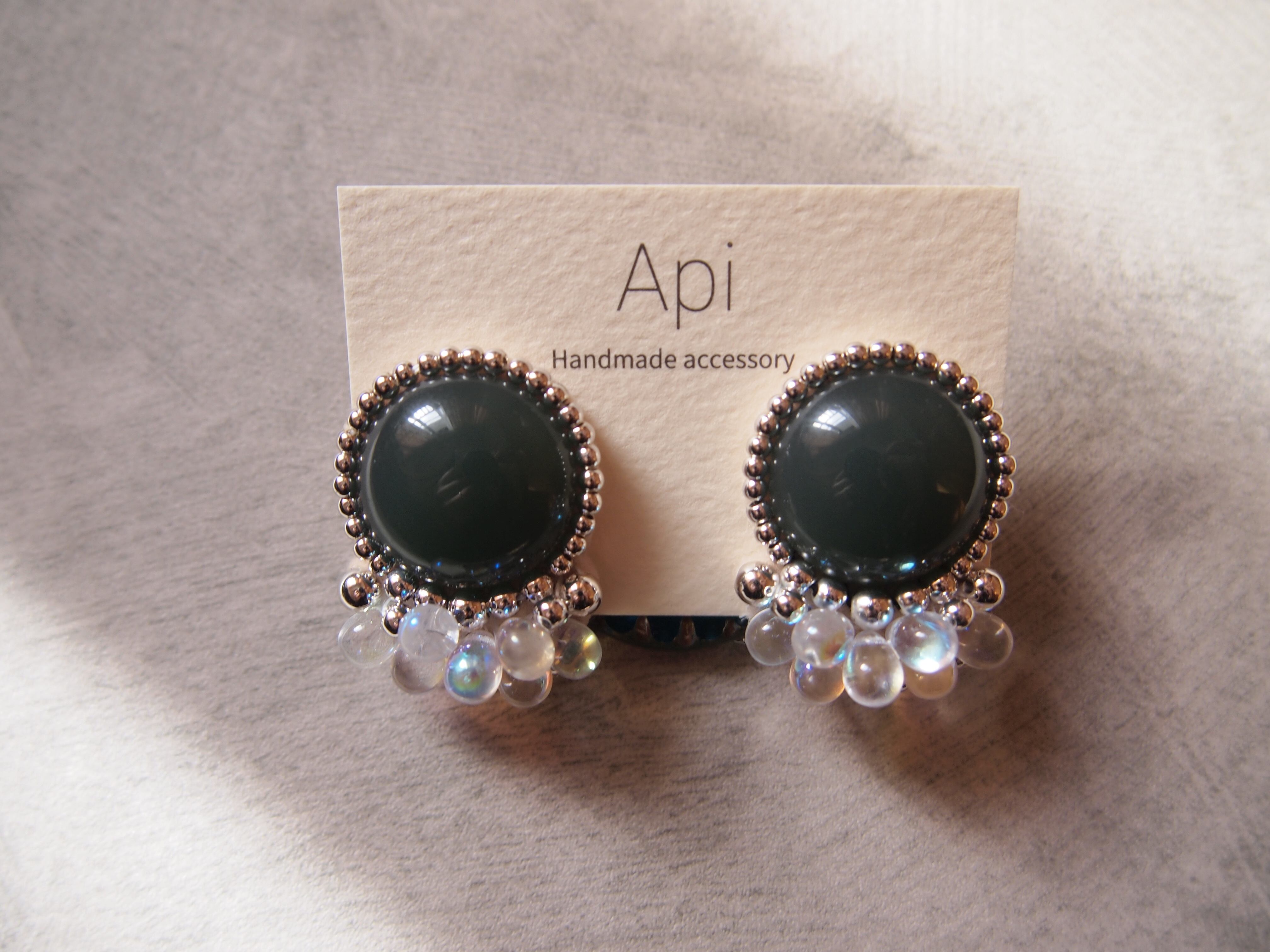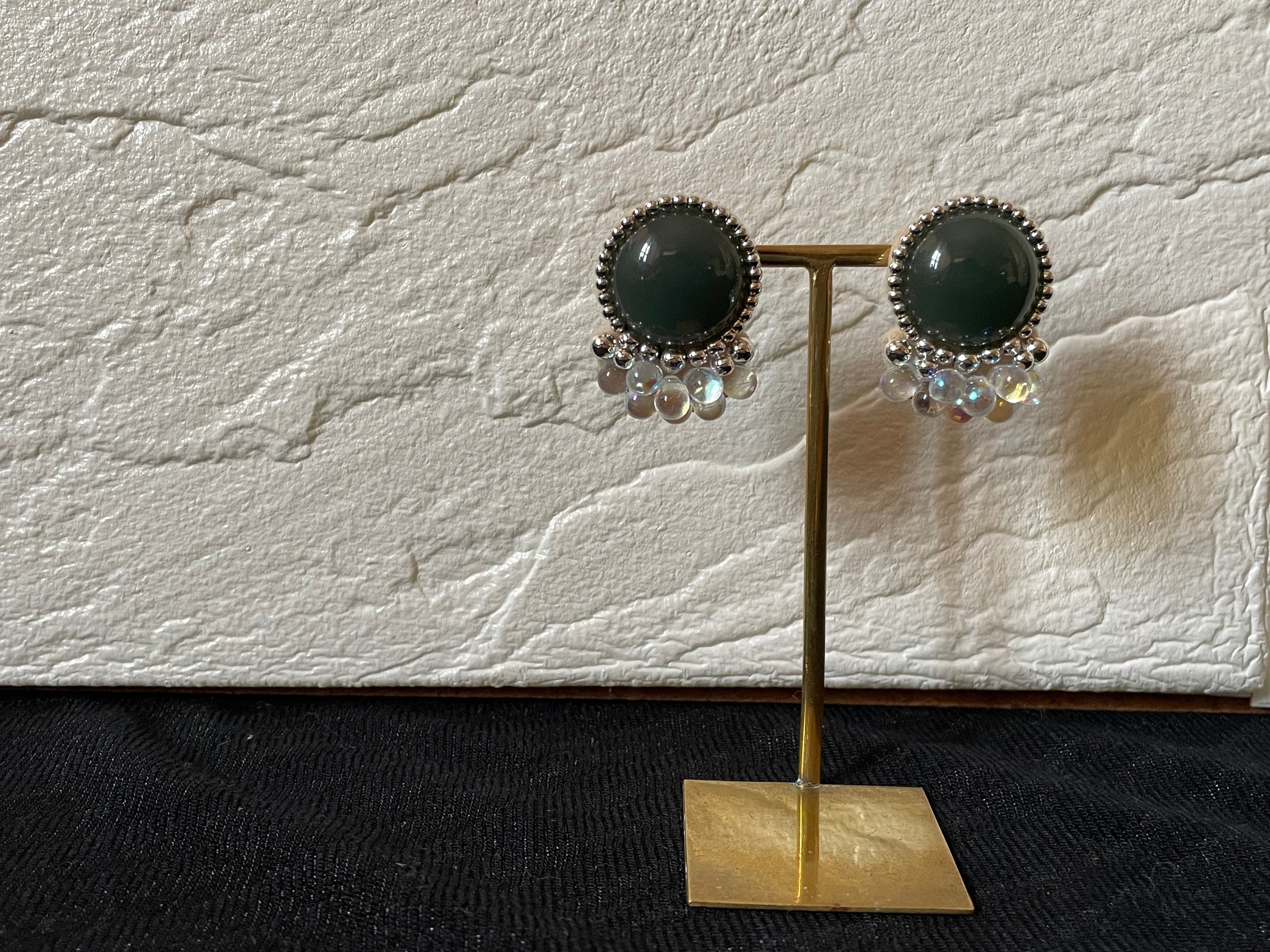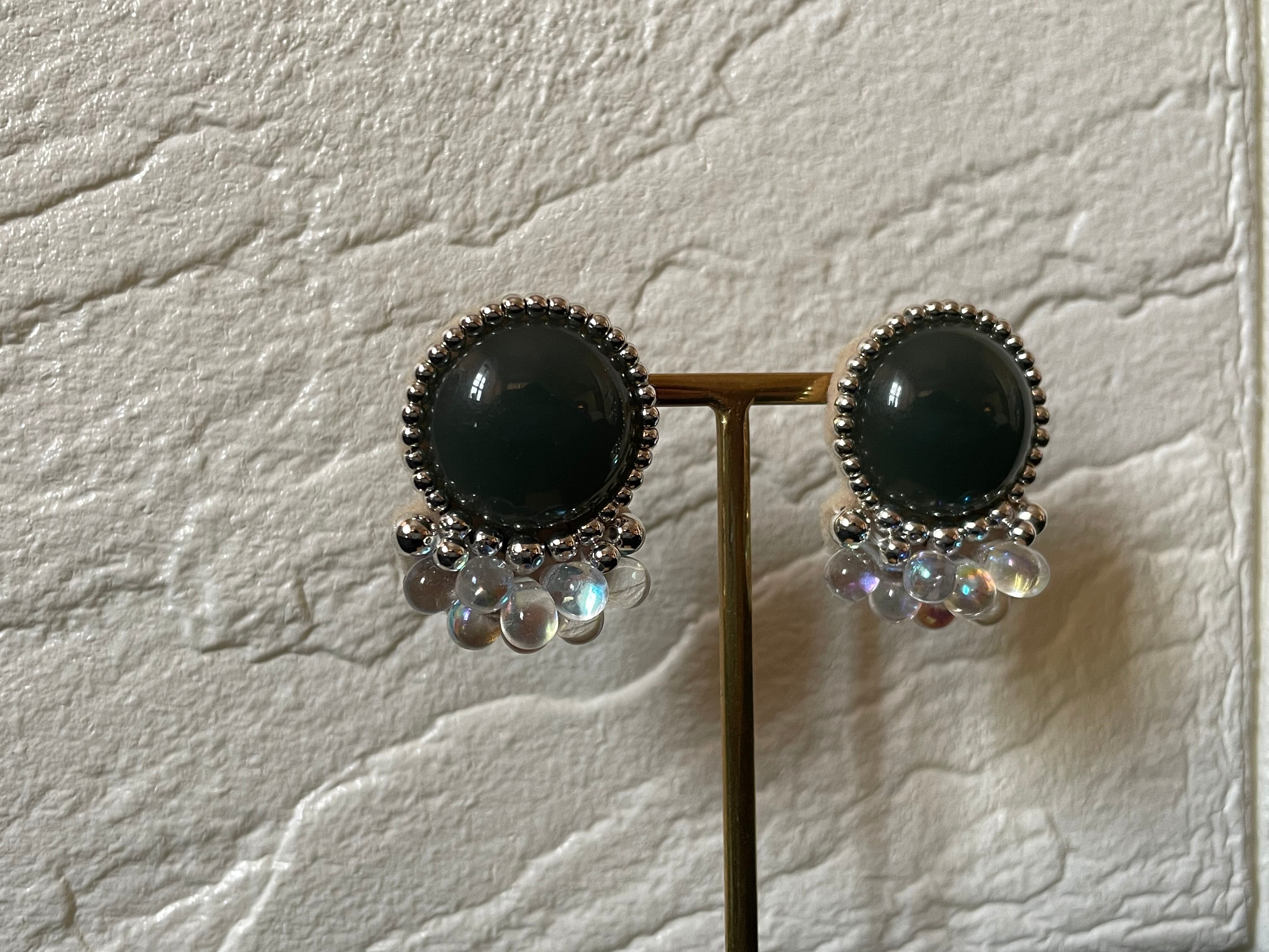 くすみカラーのカボションとつぶつぶのクリアドロップが可愛いどんな服にも合いそうな耳飾りです。