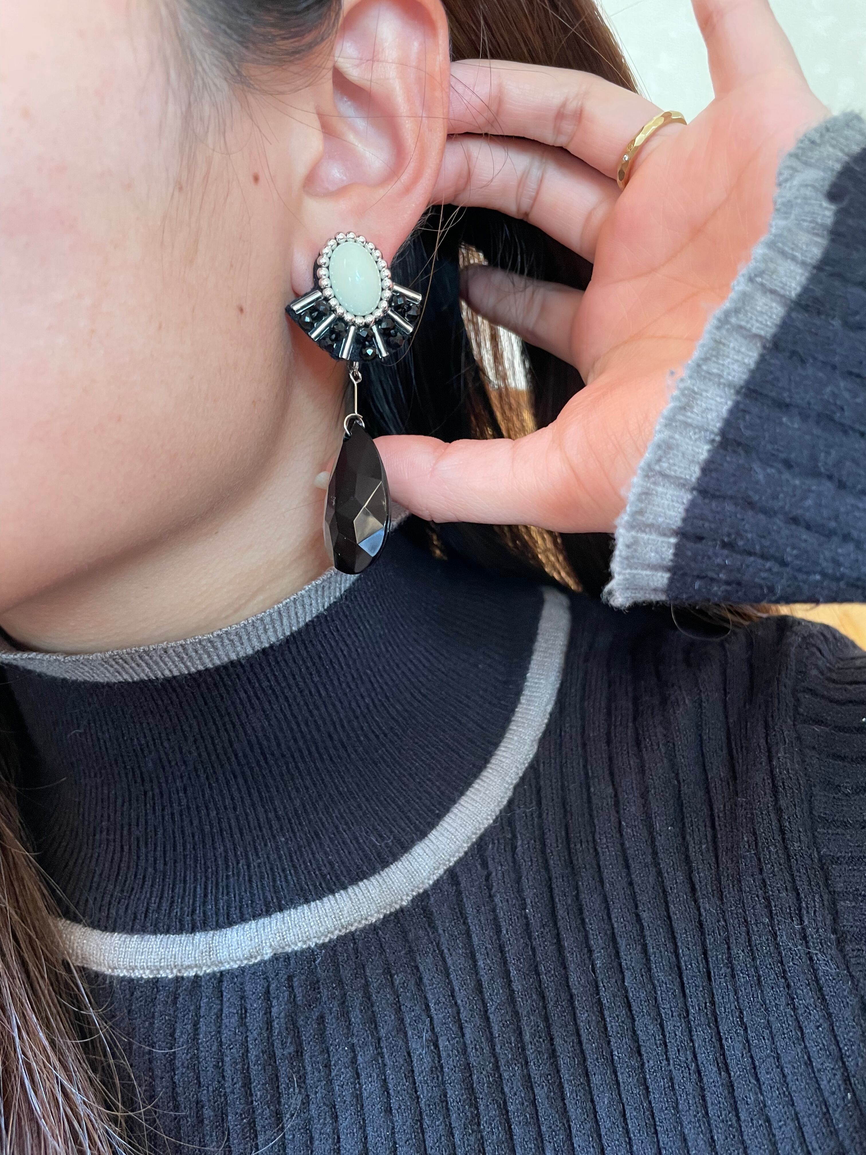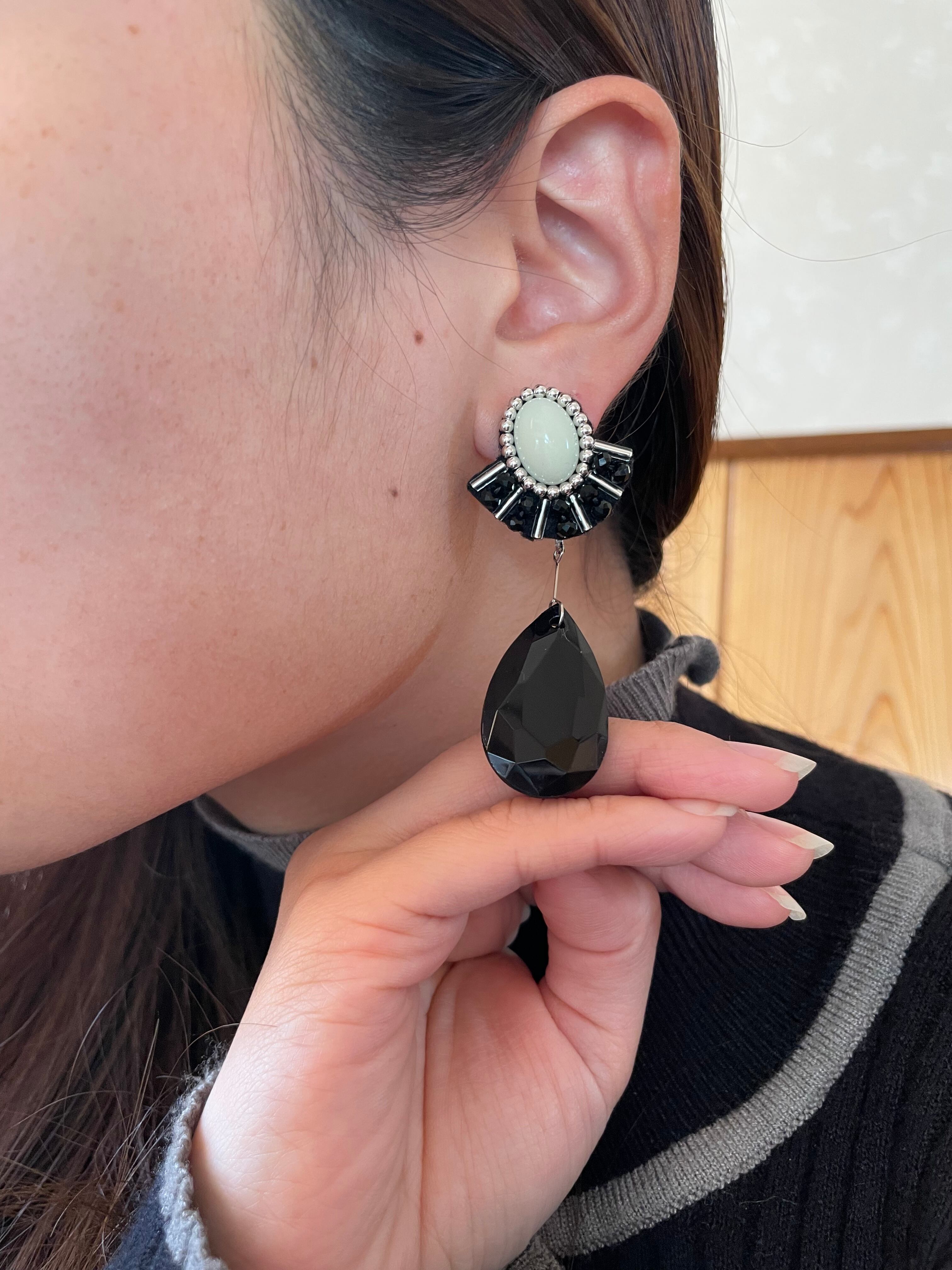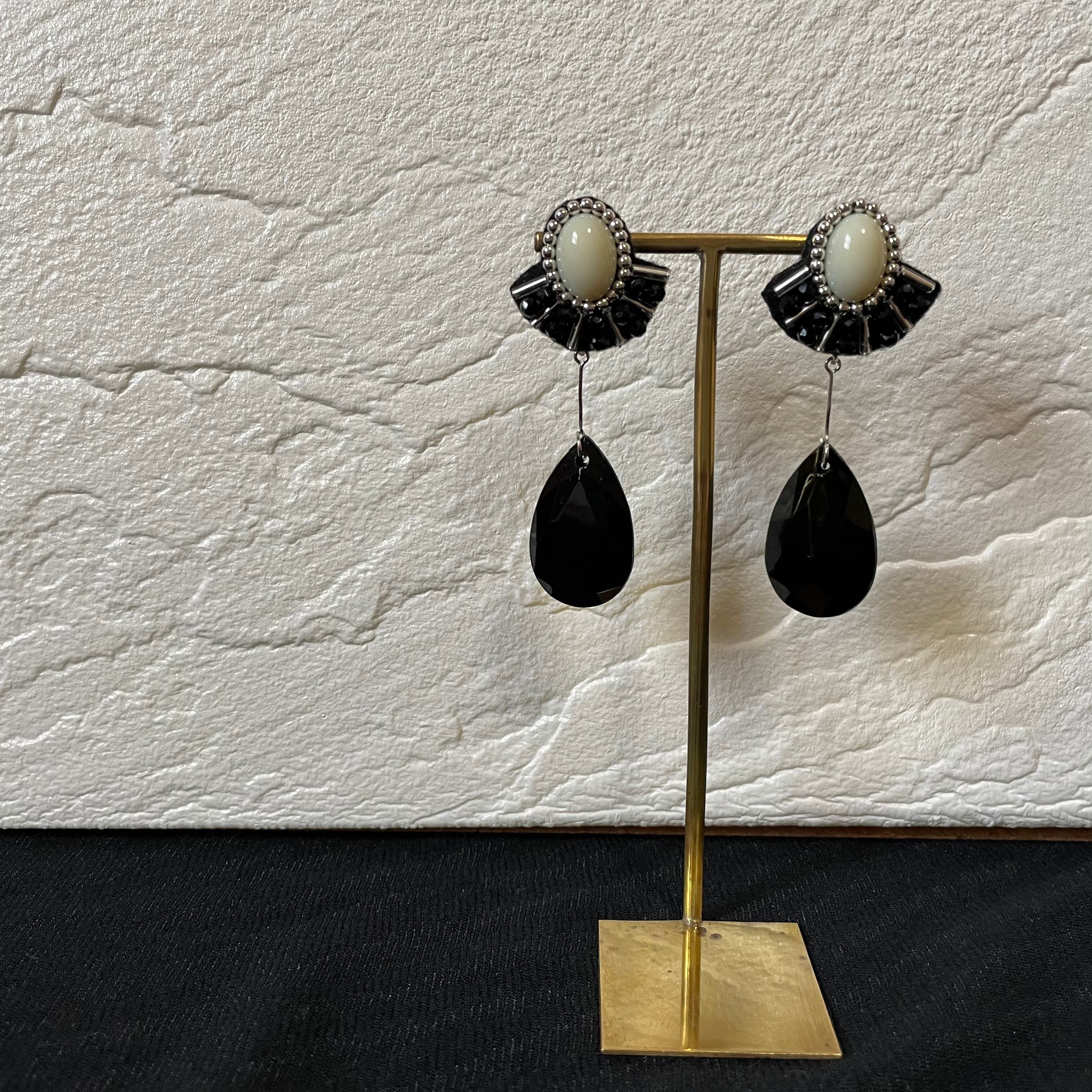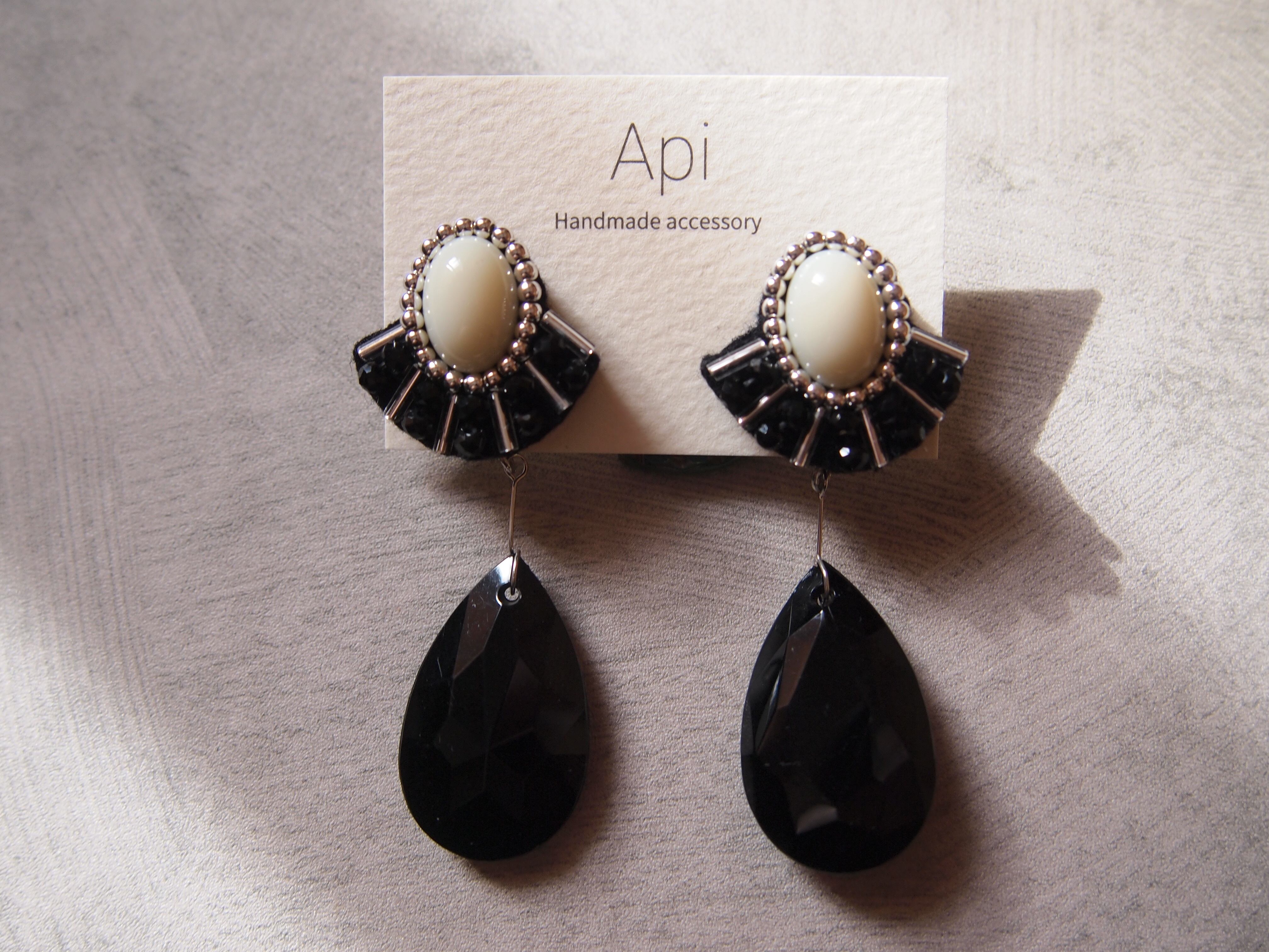 アイボリーの控えめカボションに大ぶりのドロップビーズでバランスを取っています。