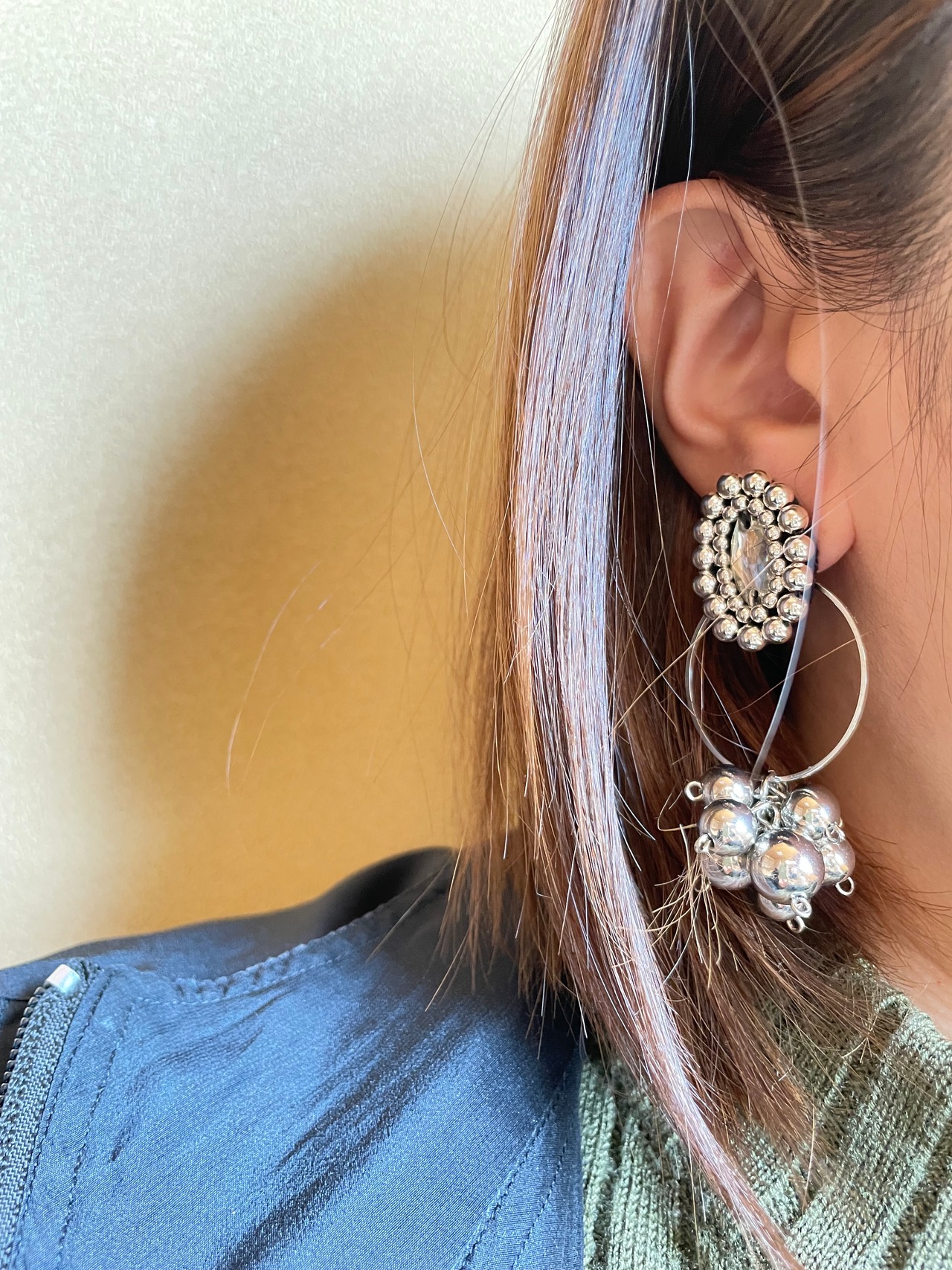 シルバー単色でお作りしているので、色んなお洋服に合わせやすく使い勝手がいいと思います